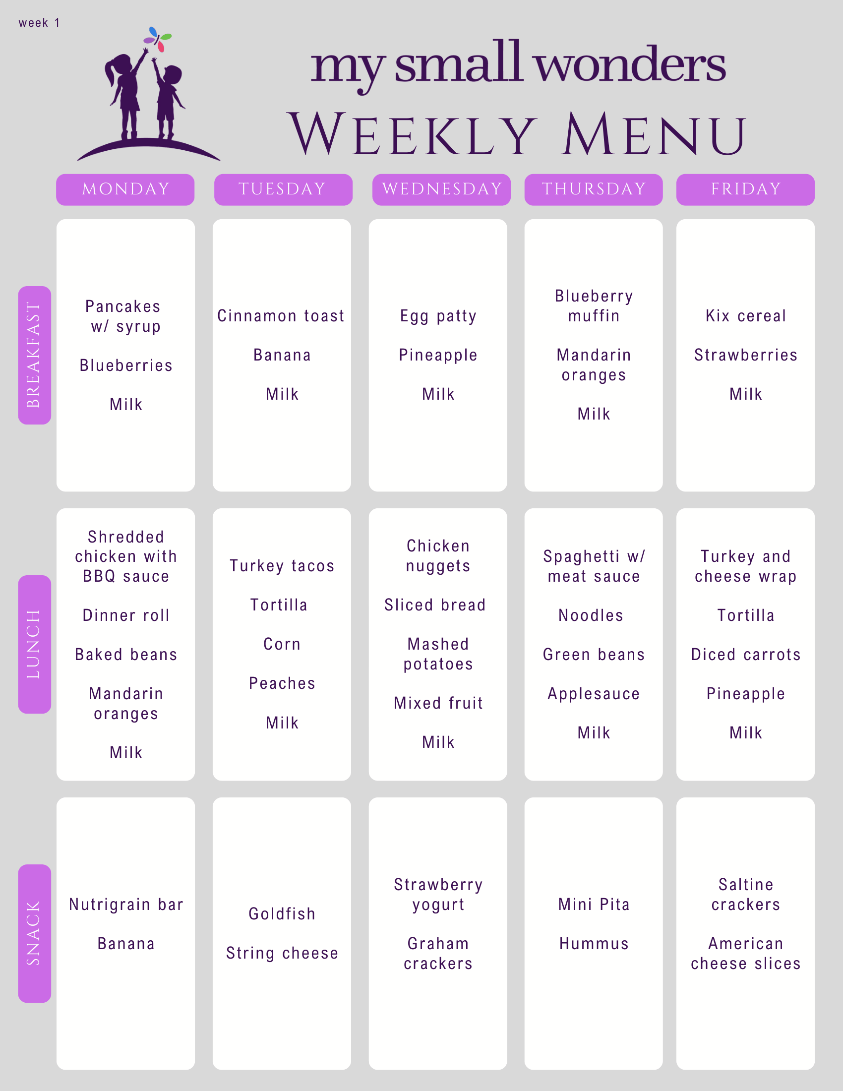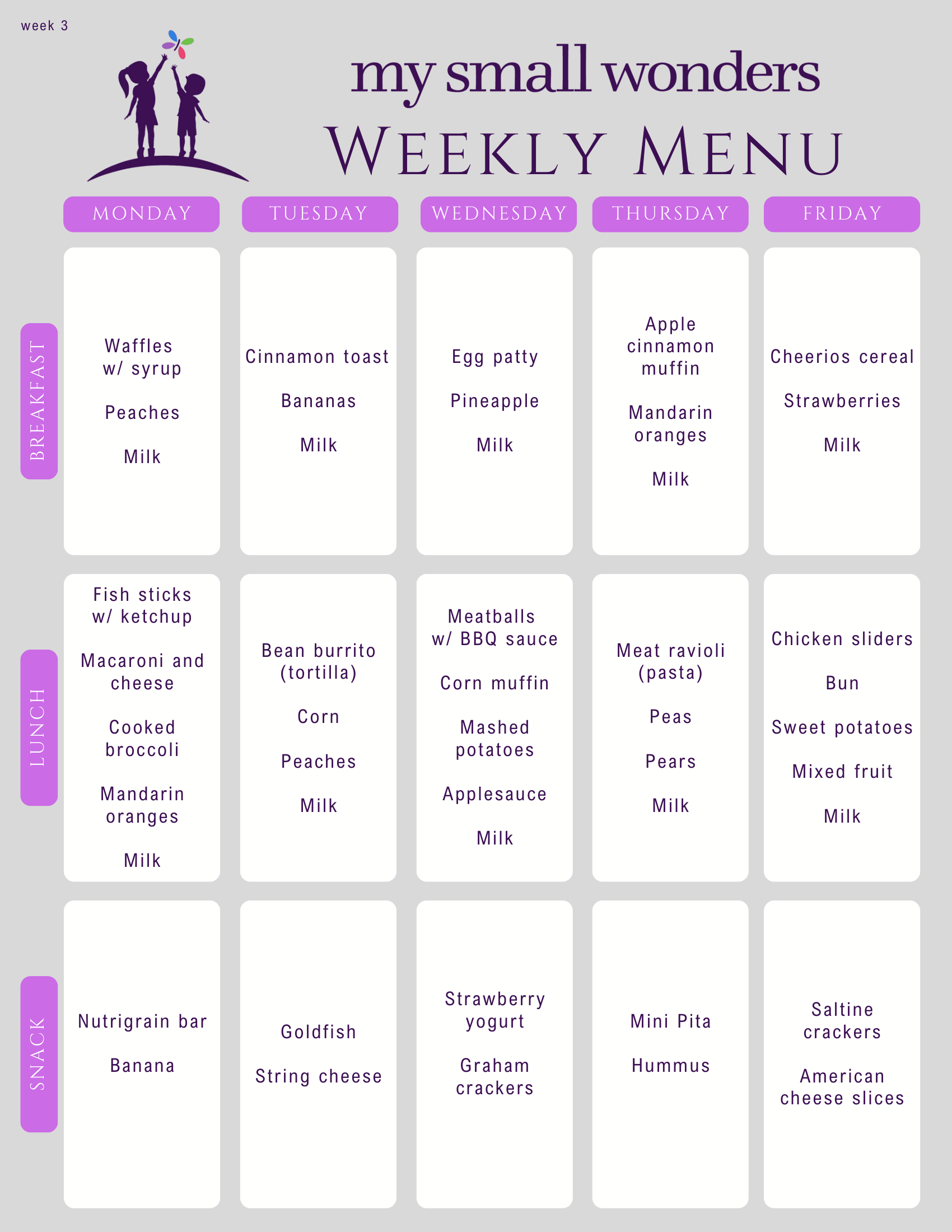 With the exception of infants, children enrolled at My Small Wonders are served breakfast, lunch, and an afternoon snack. Your child’s nutrition is as important to us as it is to you, which is why we have worked with two different dietitians to come up with a 4-week rotating menu. These menus offer not only healthy choices, but also items that children will genuinely enjoy eating.
